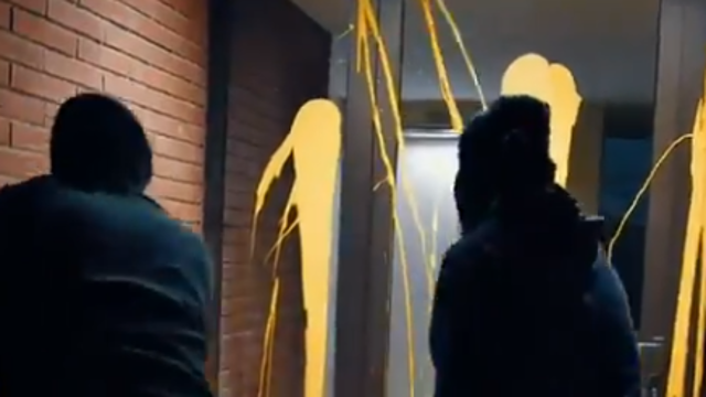 En su cuenta en Twitter, Arran ha colgado este miércoles un vídeo en el que se observa cómo dos jóvenes llegan a un portal y arrojan pintura de color amarillo sobre la puerta acristalada de entrada.