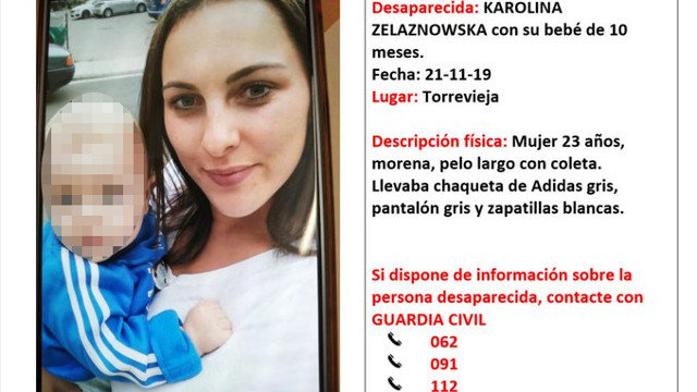 A Generalitat Valenciana, a petición da Garda Civil, difundiu a foto da muller e o bebé na súa conta de Twitter, onde recolle que a última posición da pulseira de protección da moza sitúase na estación de autobuses de Torrevieja, desde onde hai conexións a diferentes puntos de España, como Madrid, Bilbao, València e Murcia.