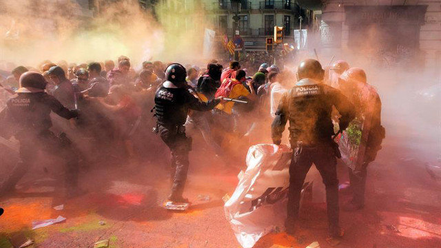 Los Mossos cargan contra manifestantes soberanistas que les lanzaron polvos de colores.MARTA PÉREZ