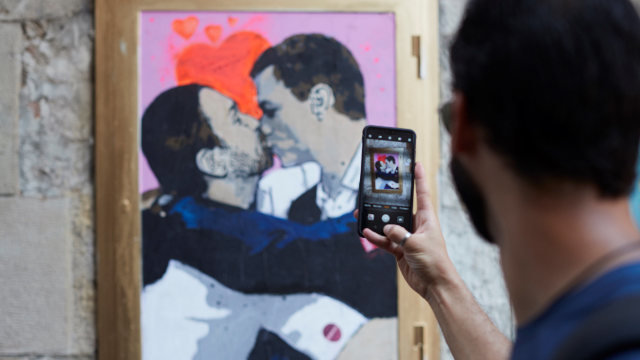 O artista urbano TVBoy plasmou este xoves nunha parede do centro de Barcelona a súa última obra, que mostra ao presidente do Goberno en funcións, Pedro Sánchez, e ao líder de Unidas Podemos, Pablo Iglesias, que recorda ao histórico ósculo dado entre os líderes comunistas Leonidas Breznev e Erich Honecker durante a celebración do 30 Aniversario da República Democrática Alemá, posteriormente plasmado nun mural no muro de Berlín.