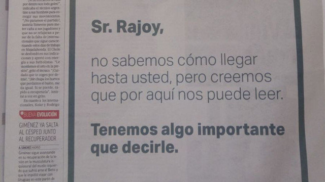 El miércoles se publicó en el diario Marca un anuncio que causó desconcierto y que decía: “Sr. Rajoy, no sabemos cómo llegar hasta usted, pero creemos que por aquí nos puede leer. Tenemos algo importante que decirle”. Y el jueves el propio periódico deportivo llevaba otro en formato similar: “Sr. Rajoy, este domingo, a las 21.25 horas, vuelve 'Salvados'. Si quiere ser uno de nuestros invitados, estaremos encantados”.