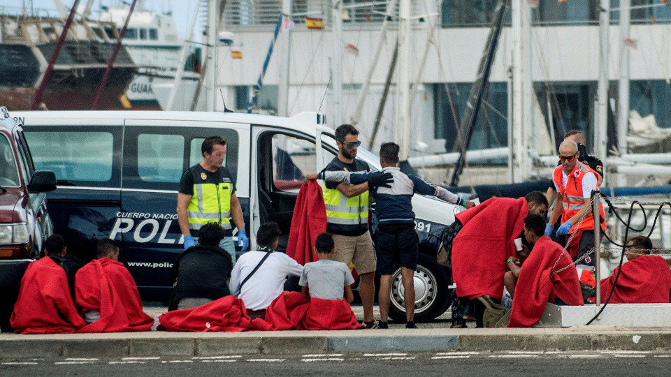 Llegada al puerto de Naos, en Arrecife, del grupo de 28 inmigrantes que navegaba en una patera rumbo a Lanzarote tras ser interceptados por la Guardia Civil. JAVIER FUENTES (EFE)