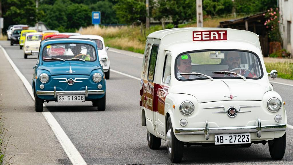 Más de un centenar de vehículos del mítico Seat 600 recorrieron este viernes la capital lucense como parte de una ruta que organiza cada año la asociación Traveseat, que en esta edición discurrió por el Camino de Santiago.
