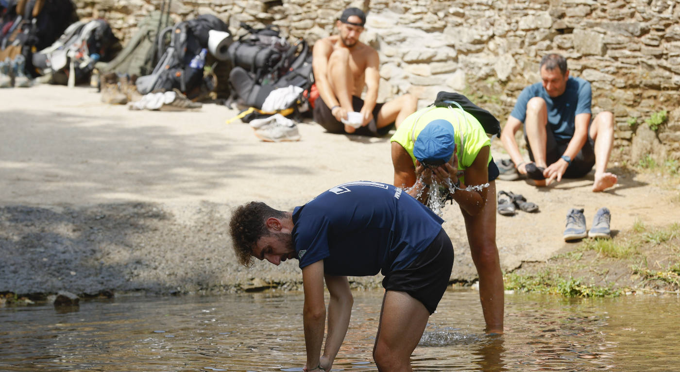 Los peregrinos descansan en un río en Ribadiso, Arzúa, para escapar de la ola de calor. EFE/ Lavandeira Jr
