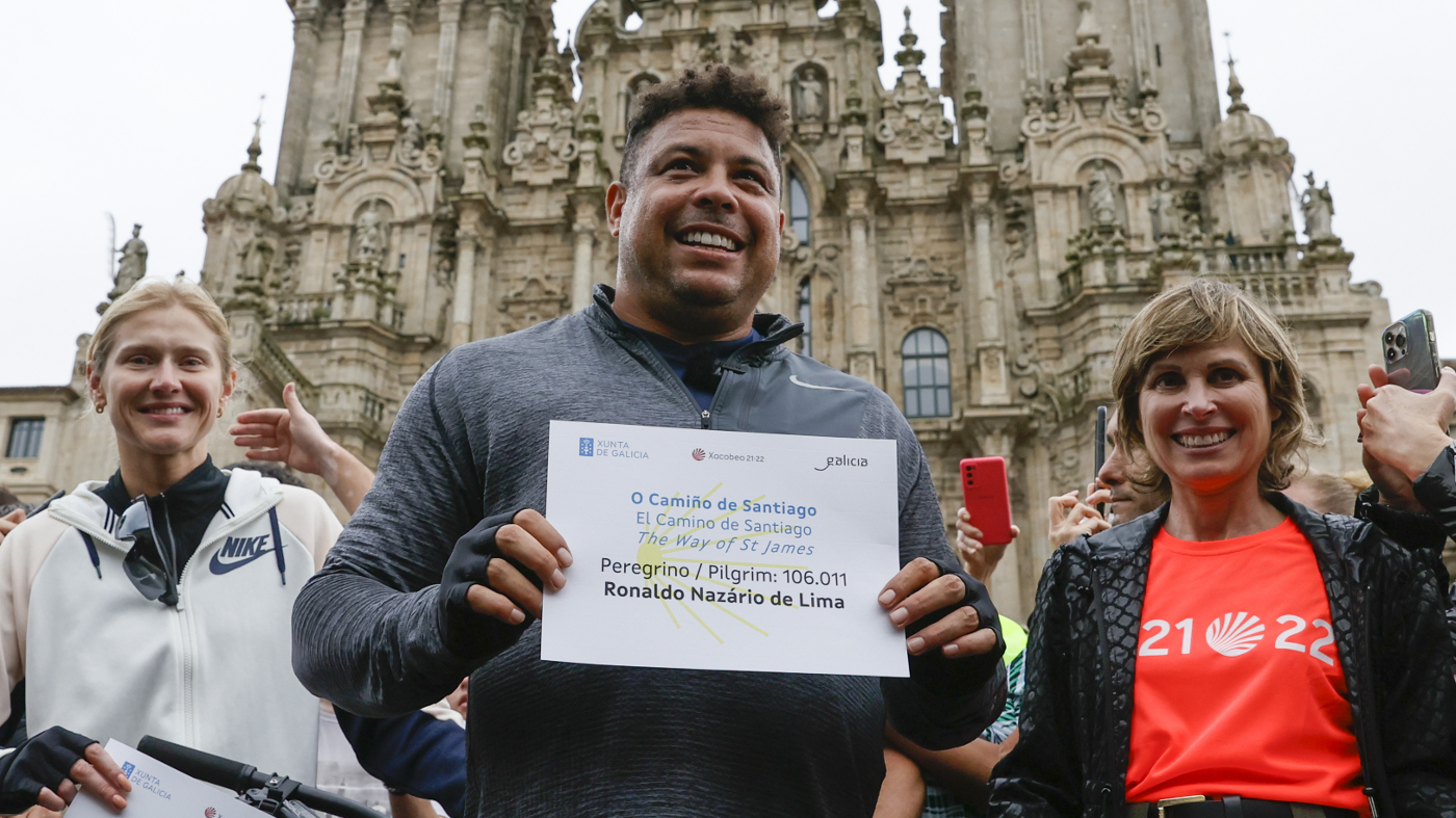 El presidente del Real Valladolid, Ronaldo Nazário, ha llegado nueve minutos después de las cuatro de la tarde de este miércoles a la compostelana Plaza del Obradoiro tras convertirse en peregrino para cumplir con la promesa de que si ascendían a Primera División, él sería un romero más.