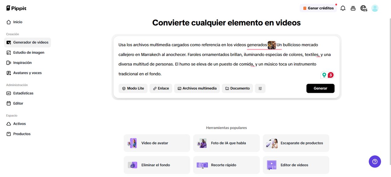 Accede a Pippit y regístrate. Entra en la pestaña "generador de video" y haz clic en "archivos multimedia" para subir imágenes de referencia desde tu dispositivo, teléfono, Dropbox o enlace. Elige opciones de recursos cuando no tengas una imagen. Crea un prompt de texto que describa la secuencia o el tono de la historia. La combinación de imagen de referencia y prompt guía al generador. Pulsa "generar" para comenzar.