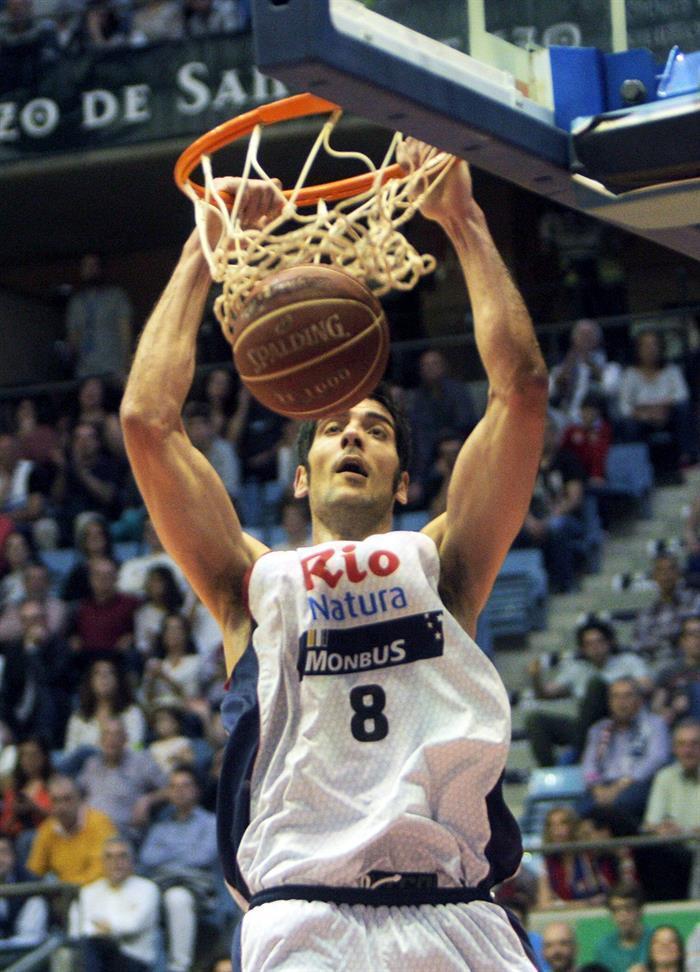 El pívot del Río Natura Monbus Obradoiro, Juanjo Triguero realiza un mate en la canasta del Bilbao Basket