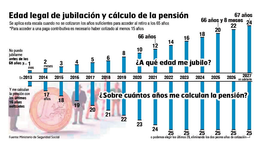 Es un nuevo paso en el retraso progresivo que la edad de jubilación ordinaria que comenzó a aplicarse en 2013 fruto de la reforma de las pensiones de 2011 y culminará en 2027, cuando los profesionales cuya vida laboral sea inferior a los 38 años y seis meses tendrán que esperar a los 67 años para dejar definitivamente el mercado de trabajo con un paga pública.
