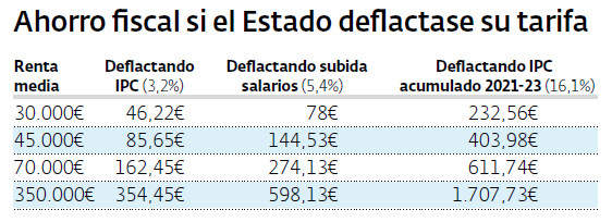Sería así si se aplicase una deflactación del 16,1%, equivalente al IPC acumulado de 2021 a 2023. Si ese ajuste se quedara en el 3,2% — en línea con el índice de precios de consumo de 2023—, el ahorro fiscal para las rentas medias sería de 46,22 euros, en tanto que se elevaría a 78 aplicando un 5,4%, correspondiente al repunte del sueldo medio en el ejercicio pasado.