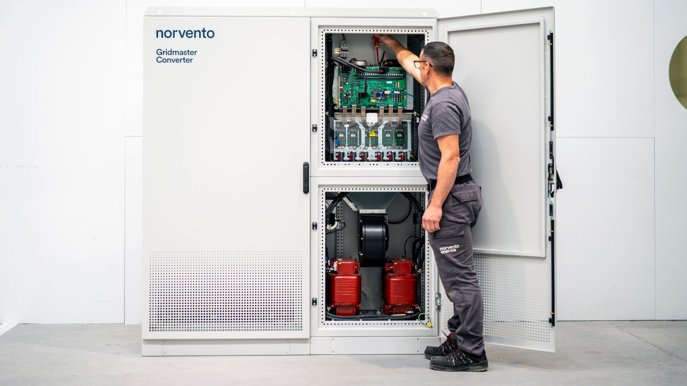 Norvento Gridmaster Converter es una innovadora plataforma de convertidores de electrónica de potencia que puede operar conectada a la red, en redes débiles o en sistemas aislados y microrredes. Está llamada a mejorar la gestión y el almacenamiento eficiente de la energía. Esta tecnología transforma corriente continua a alterna, y viceversa, y gestiona los flujos de energía hacia la red eléctrica o un sistema de baterías. En este último campo, el del almacenamiento, Norvento ha desarrollado el nBESS, un sistema contenerizado que cuenta con un convertidor y baterías.
