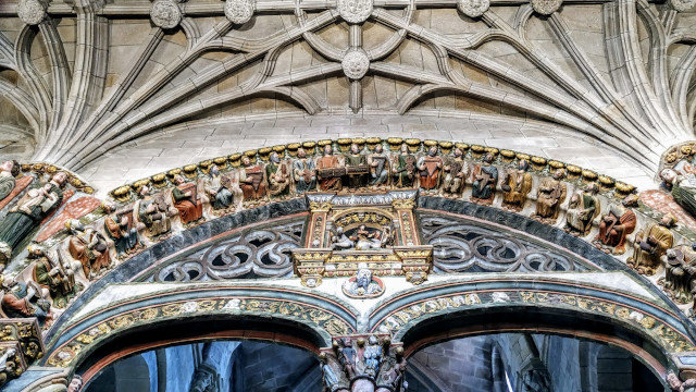 La catedral es una señora catedral. La recorre y se fija en tres cosas para no disiparse. El Pórtico do Paraíso luce tras haber sido restaurado con sus dieciochescos colores. Debe mucho al de la Gloria compostelano, pero tiene demasiada calidad para que la palabra copia, con su carga peyorativa, le cuadre: es magnífico, sin más. Como lo es el retablo mayor, obra de Cornielles de Holanda, del siglo XVI, aunque barroco en su esplendor dorado. Por último se para ante la imagen del Santo Cristo, cómo no hacerlo con la legión de devotos que tiene. Se acomoda en un banco y deja pasar unos minutos, cosa que acostumbra a hacer en todas las catedrales.