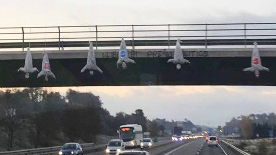 En uno de los puentes sobre los que pasa la citada carretera se han colgado un total de siete figuras con los logos del Partido Popular de Cataluña, el Partido Socialista de Cataluña y Ciudadanos, en clara alusión a los votantes de estas tres formaciones.