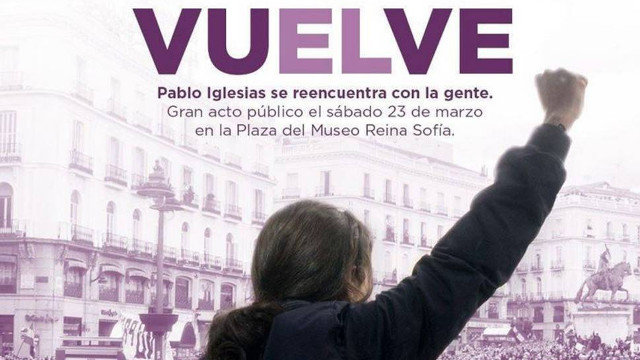 O secretario xeral de Podemos, Pablo Iglesias, cualificou como un erro o cartel que publicou o seu partido para anunciar o seu regreso á primeira liña política o 23 de marzo, coa mensaxe de 'VOLVE' coas letras 'EL' destacadas sobre unha foto do líder morado.
