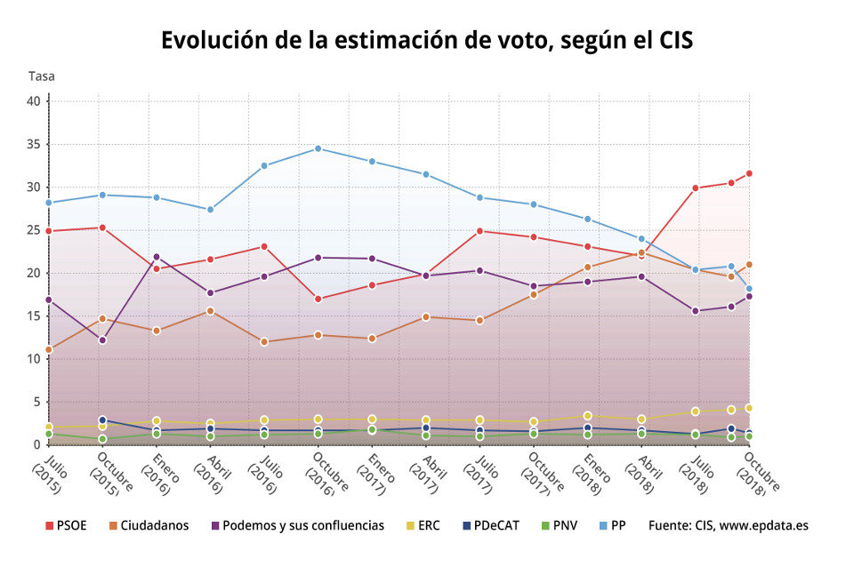 Según la encuesta, el PSOE subiría del 30,5 del pasado mes de septiembre al 31,6 de octubre, mientras que el PP cae más de dos puntos en ese mismo periodo, del 20,8 al 18,2.