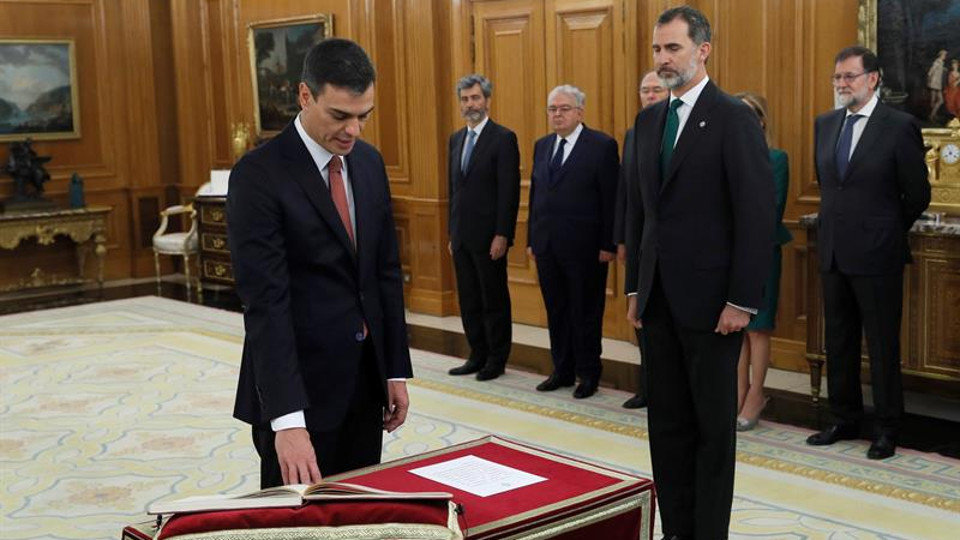 Sánchez ha optado por esta fórmula después de que la Casa del Rey acordara en julio de 2014, poco después de la proclamación de Felipe VI, dar la opción a los altos cargos de jurar o prometer ante la Biblia y la cruz o sin ellas delante. En la ceremonia, ha estado presente el jefe del Ejecutivo saliente, Mariano Rajoy, y las principales autoridades del Estado.