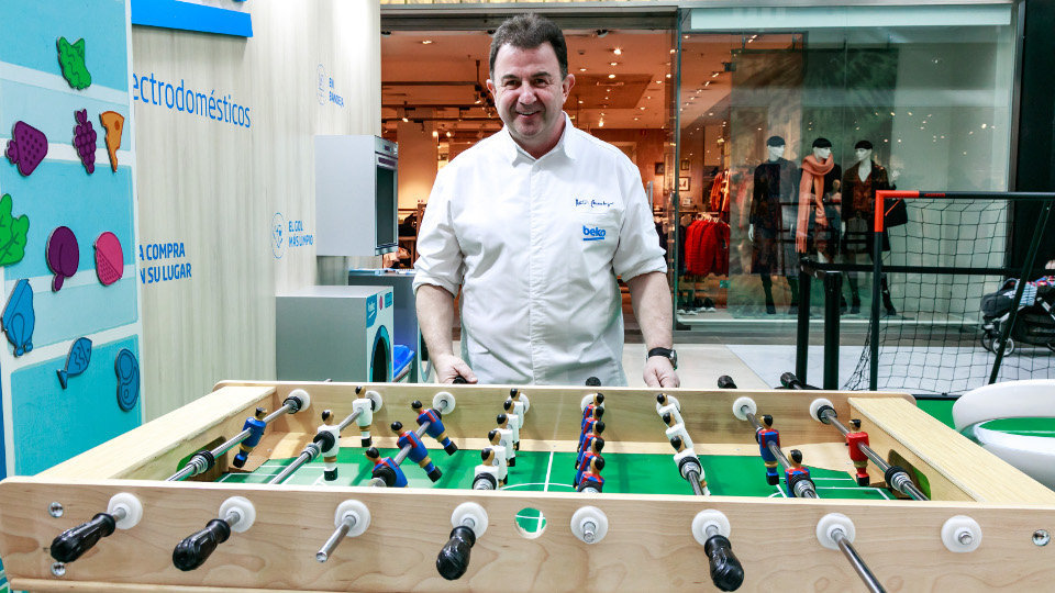 ES COCINERO a tiempo completo. Este viernes estaba en Santiago y se pasó el día con la chaqueta blanca. Los botones marcan la caja de un pecho de 58 años, que mantiene la hechura de cuando tenía 17 y remaba con los Arraun Lagunak en su San Sebastián natal. Lleva quince días desarrollando una promoción de Beko. Casi no duerme, pero nunca deja de restar una hora al sueño para caminar. Los domingos se pone en marcha a las 7.30 de la mañana para ir desde Lasarte hasta la playa de La Concha en una caminata de tres horas. La noche anterior tuvieron que infiltrarle la rodilla, como si fuese un maratoniano al final de su carrera. Llega tarde y se disculpa con un acento sonoramente vasco: "Es que me he encontrado con uno y me he dicho: ‘A este lo conozco de algo’. Era el presidente del Compos. Hacía veinte años que no lo veía". La memoria, como el ánimo, los mantiene exultantes.