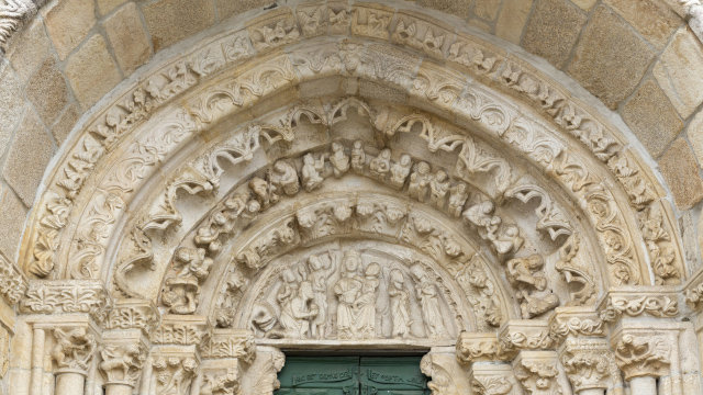El tímpano de Santa María del Azogue es de un apacible encanto. La Virgen con el Niño, en lo que parece una mezcla de Anunciación y Adoración de los Reyes.