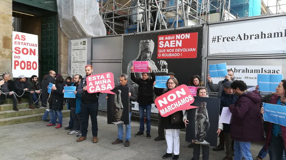 Unha vintena de membros do BNG encadeouse este luns ás portas o Pazo de Xelmírez, en Santiago de Compostela, para reclamar que as estatuas do Pórtico da Gloria en poder da familia Franco "non saian" deste edificio, onde desde fai sete meses exponse as esculturas de Abraham e Isaac realizadas polo Mestre Mateo. Coincidindo coa xornada na que estas estatuas deben abandonar o Pazo de Xelmírez e retornar cos Franco despois de concluír a exposición, o BNG convocou unha concentración para reclamar que a familia do ditador "devolva o roubado", así como actuacións para evitar que esta retirada se efectúe.