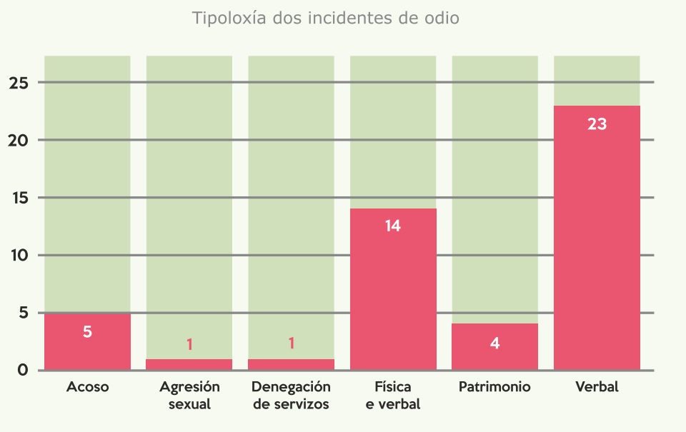 Por cantidad, casi la mitad de estas situaciones se corresponden con insultos. En una de cada tres, los ataques verbales se acompañaron de golpes. Y son violencias, explica el informe, que se incardinan en espacios que forman parte de la vida cotidiana de los afectados. Por cuarta vez consecutiva, la vía pública es el lugar donde ocurren con mayor frecuencia, con once casos. Pero el ámbito privado no siempre sirve de refugio, sino todo lo contrario: nueve de los incidentes denunciados se dieron en el domicilio de la víctima. Les siguen, empatados a seis, los centros educativos, los centros sanitarios y los espacios de ocio.