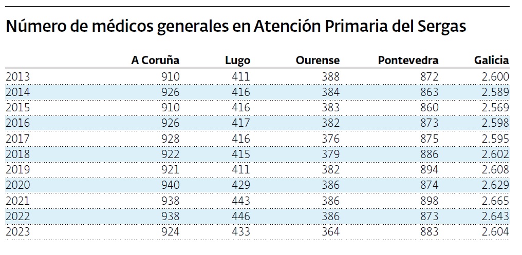 Las estadísticas de recursos humanos de sanidad ofrecidas este viernes por el Ige muestran que la cifra de facultativos generales trabajando en la puerta de acceso a la sanidad pública descendieron en A Coruña –son 14 menos que en 2022–, Lugo –13 menos– y sobre todo Ourense –18 menos–, pero no así en Pontevedra, donde en cambio eran una decena más.
