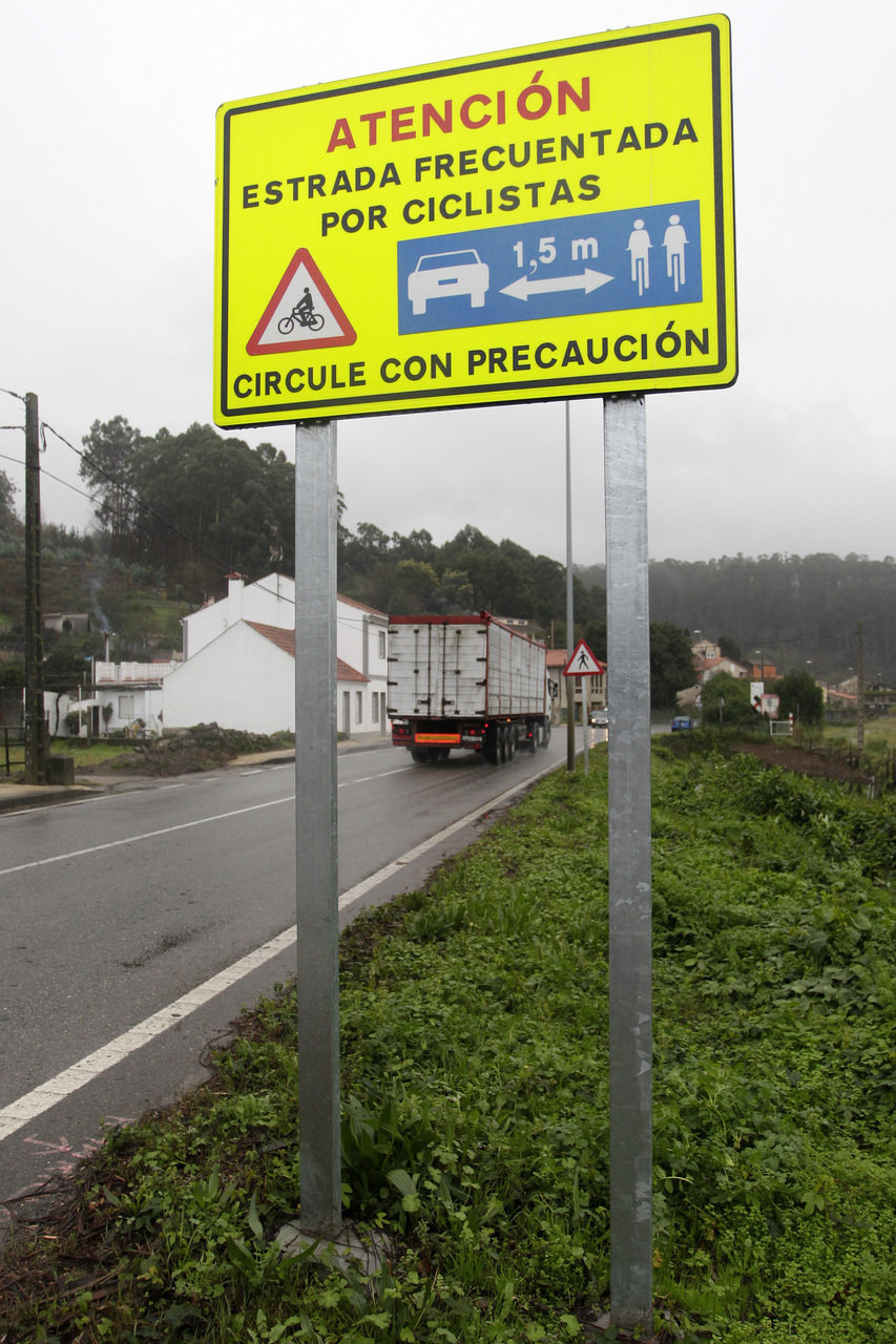 Sitúa a narración entre os dous accesos ao Pazo de Lourizán, en dirección a Pontevedra. "ían os dous (ciclistas) de palique, á par e moi anchos, á súa bóla. Cando me fun achegando onde eles, piteilles coa única bucina que ten o meu camión. De fronte viña un coche que quería coller á esquerda, pero tivo que deixarnos pasar a nós".