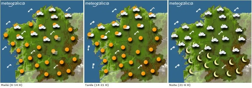 A Coruña 17° 21°, Ferrol 17° 24°, Lugo 12° 23°, Ourense 14° 30°, Pontevedra 16° 27°, Santiago de Compostela 15° 23° e Vigo 16° 29°.