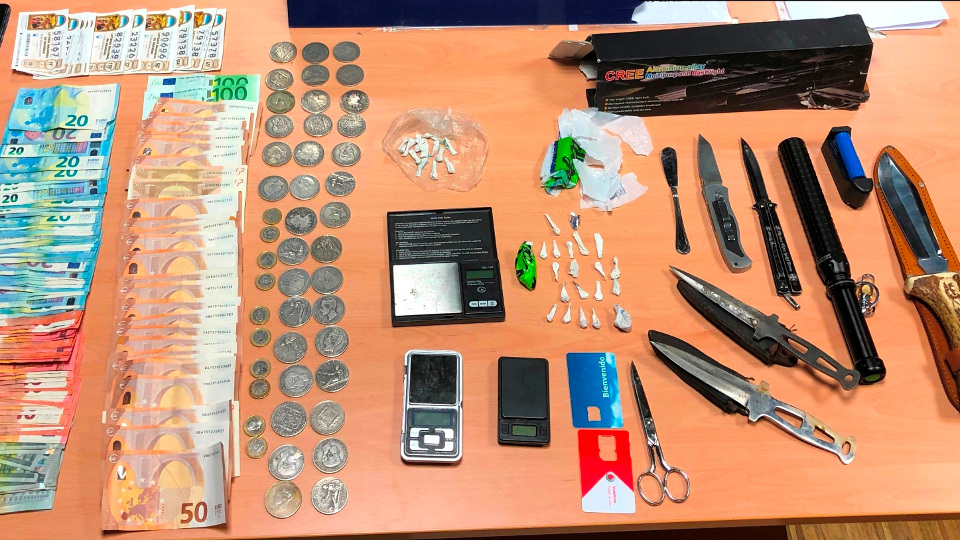 DETENCIONES Y REGISTROS. El desenlace de la investigación se produjo este jueves, con la detención de los 6 sospechosos, y con la entrada y registro en los dos domicilios, autorizados por el juzgado de instrucción número 4 de Vigo. En los registros, la Policía se incautó de 100 dosis de cocaína, 30 dosis de heroína, 2.900 euros en efectivo, 5 armas blancas, una defensa extensible, varias básculas, 17 décimos de lotería, 36 monedas de plata, diversas joyas y relojes.
