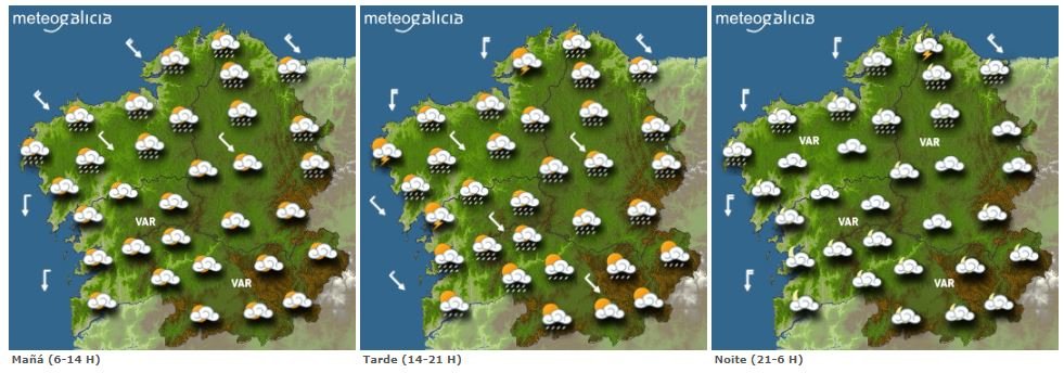 O domingo continuará a inestabilidade atmosférica en Galicia, de modo que os ceos estarán nubrados e haberá chuvascos, que serán máis frecuentes canto máis ao norte, localmente tormentosos e con posibilidade de saraiba.
