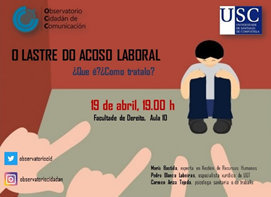 A Facultade de Dereito da USC acollerá este xoves 19 de abril, ás 19:00 horas unha charla sobre o acoso laboral. Os poñentes da mesma serán Carmen Ariza Tejeda, psicóloga sanitaria e do traballo, María Bastida Dominguez, profesora de Direción e Xestión de Recursos Humanos na Facultade de Relacións Laborais da USC, e Pedro Blanco Lobeiras, avogado da asesoría xurídica de UGT.