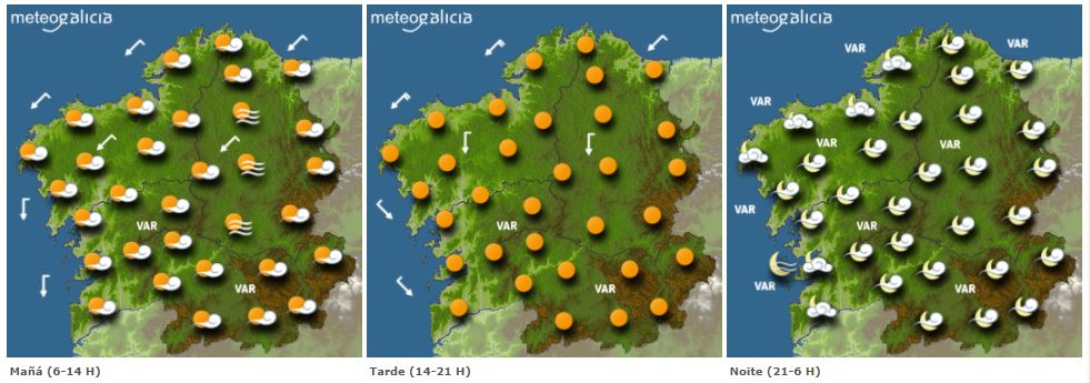 Galicia continuará o luns baixo influencia anticiclónica, de modo que para este luns espéranse algúns bancos de nubes en zonas de interior que darán pasos a strong <>ceos en xeral despexados, con algunhas nubes de tipo alto, que non impedirán o paso do sol.