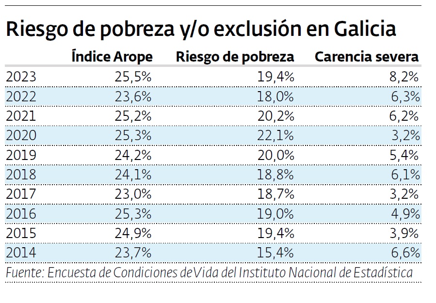 Cerca de 690.000 personas están en riesgo de pobreza y/o exclusión social en Galicia. Son casi 53.000 más que un año atrás. Y de ellas, alrededor de 222.000 viven en una situación de carencia material y social severa. Son datos que reflejan "el encarecimiento de la vida por la inflación y el aumento de los precios de la energía", sostienen desde la Red Europea de Lucha contra la Pobreza y la Exclusión Social en el Estado Español (EAPN-ES). La crisis de precios y de la energía puede explicar en buena medida el repunte de este porcentaje de afectados en la comunidad gallega, que creció desde el 23,6% hasta el 25,5% de sus habitantes; un aumento porcentual que solo es mayor en Navarra (+2,7) y Cantabria (+2,5), y que sitúa esta tasa como la más alta en esta última década –que es hasta donde alcanza la serie histórica–.