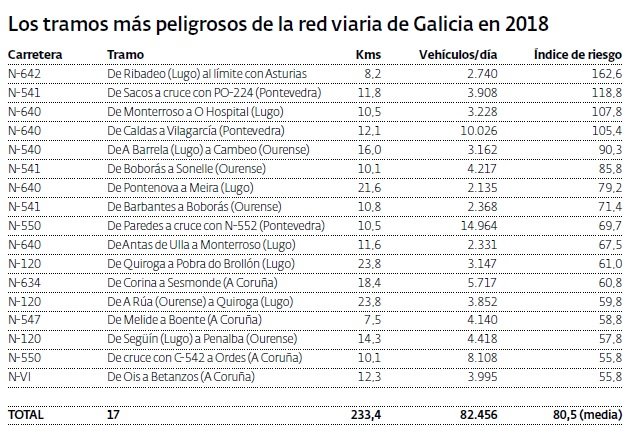 El informe marca en rojo este año 17 trayectos de carretera en Galicia, siete de ellos en la provincia de Lugo, entre los que se incluye el más peligroso de toda España. Se trata de un tramo de la N-642 en Ribadeo que comprende 8,2 kilómetros entre el cruce con la N-640 y el enlace con la N-634 —casi en Vegadeo (Asturias)—. No registró ninguna muerte este año pero entraña un enorme riesgo según el informe, que además de la siniestralidad tiene en cuenta factores como la visibilidad, el estado del firme, el peralte de las curvas o el número de sectores con adelantamientos comprometidos.