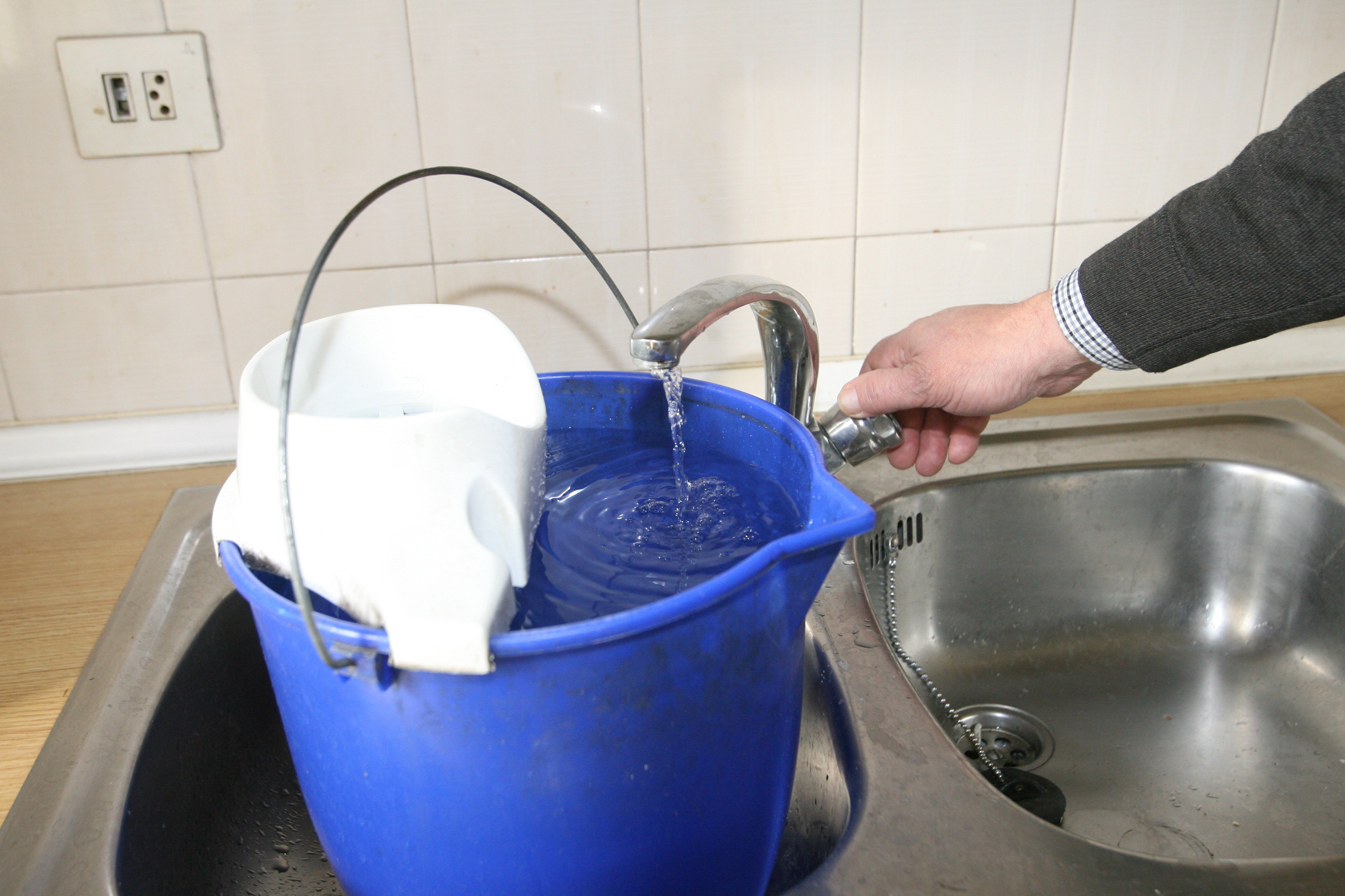 Un hombre llena un cubo de agua en su domicilio. TOÑO PARGA - Sequía