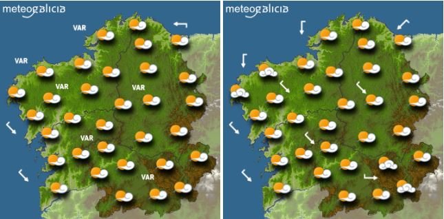 A Coruña 10° 20° Ferrol 8° 23° Lugo 7° 25° Ourense 13° 29° Pontevedra 11° 25° Santiago 12° 25° Vigo 12° 23°.