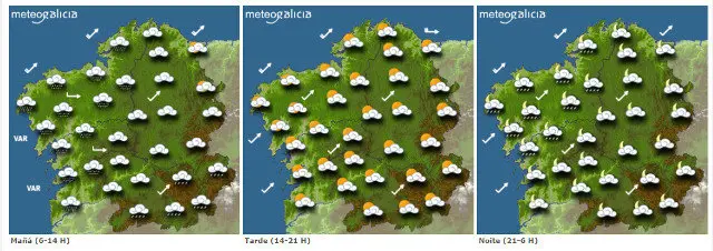 A Coruña 13° 18°, Ferrol 13° 18°, Lugo 12° 17°, Ourense 14° 20°, Pontevedra 13° 19°, Santiago de Compostela 12° 17° e Vigo 13° 20°