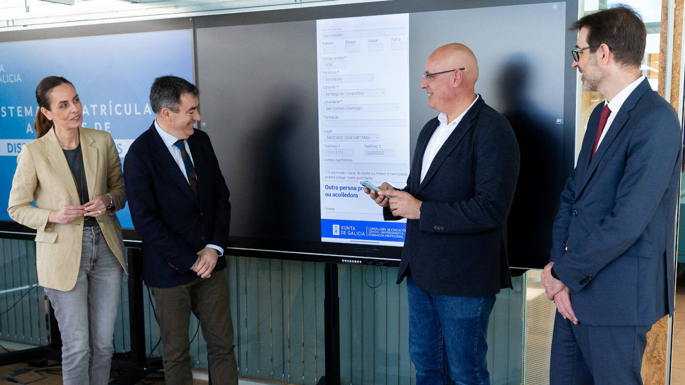 El conselleiro de Educación observa en una pantalla el proceso de matriculación escolar que puede llevarse a cabo desde el móvil. EP