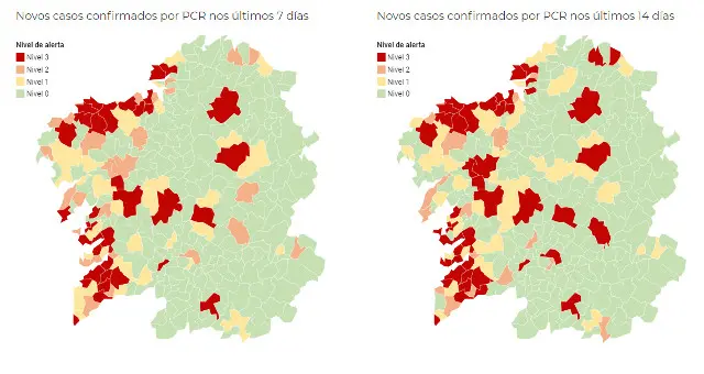 Mentres tanto, na provincia lucense quedan en vermello Lugo, Chantada e Vilalba, despois de que Monforte de Lemos pasase ao nivel laranxa; e en Ourense mantéñense dous únicos municipios, Xinzo e Ribadavia.