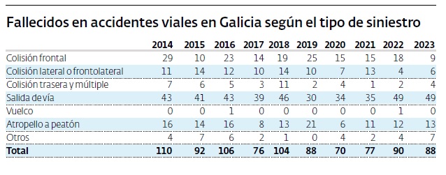 Las cifras de Galicia recogen que 49 de estas 88 víctimas perdieron la vida después de que el vehículo en el que circulaban se saliera de la carretera. Les sigue el atropello, con trece casos, uno más que en 2022 –y eso sin contar los que sucedieron en calzadas urbanas–.
