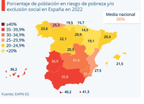 Este 23,6% de personas en situación de pobreza y/o exclusión social en Galicia mejora en 2,4 puntos el promedio del país y sitúa a la comunidad en una "posición media" respecto del resto de las autonomías. De hecho, el territorio "se revela como una fuente significativa de desigualdad", según trasladó EAPN en la exposición del informe estatal en el Congreso, abundando en que las estadísticas muestran un año más "una división de España en dos mitades": las comunidades al norte de Madrid arrojan "por lo general" tasas más bajas frente a las "extraordinariamente elevadas y muy por encima de la media" de las del sur.