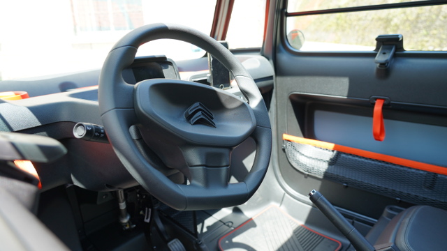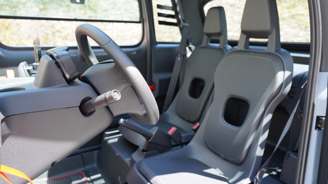 En el puesto de conducción no hay ningún lujo. Un pequeño cuadro de instrumentos para informar de la velocidad y autonomía restante, unos botones en la parte izquierda del asiento, que sirven para seleccionar la marcha adelante o atrás y, como gran guiño a la tecnología, un sencillo soporte para el teléfono móvil para el que se cuenta con un conector de recarga USB.