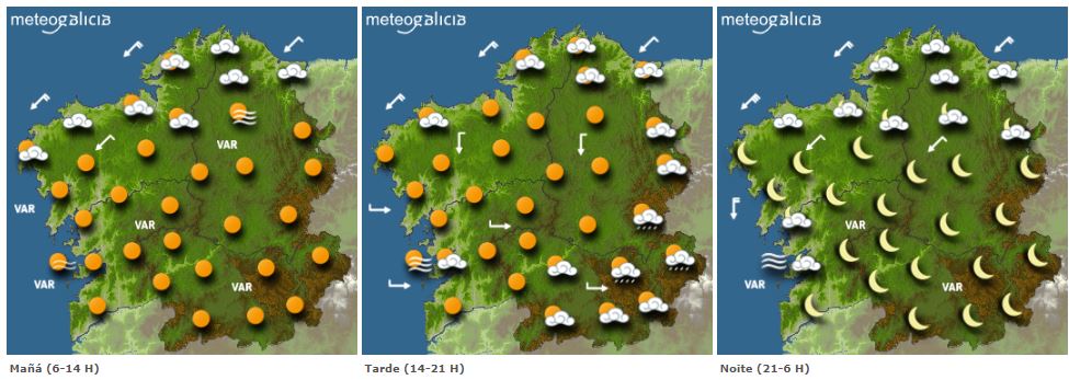 Os ventos soprarán frouxos, do nordeste, con intervalos fortes na Costa da Morte.Temperaturas mínimas e máximas previstas para o domingo: A Coruña 19°/24°; Ferrol 17°/26°; Lugo 15°/29°; Ourense 18°/38°; Pontevedra 17°/28°; Santiago 16°/31°; Vigo 17°/27°.