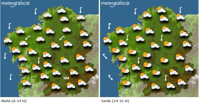 O vento soprará frouxo de compoñente norte, máis intenso entre a Costa da Morte e as Rías Baixas pola tarde e zonas altas do interior.
