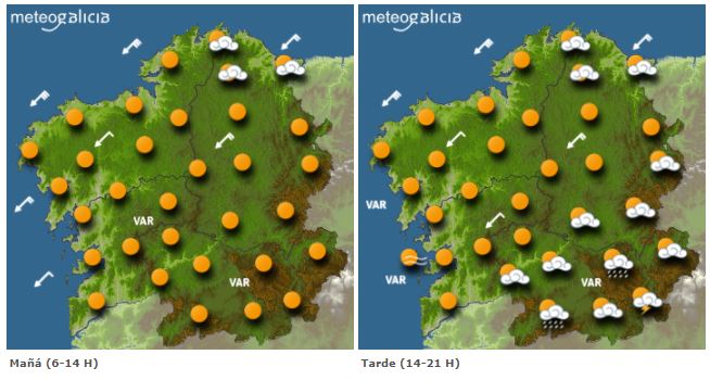 As temperaturas non experimentarán cambios significativos, e as máximas oscilarán entre os 35 graos previstos en Ourense, e os 30 graos que se esperan en Santiago ou Vigo; mentres que as mínimas estarán entre os 15 graos de Lugo ou Ourense, e os 21 de Vigo.