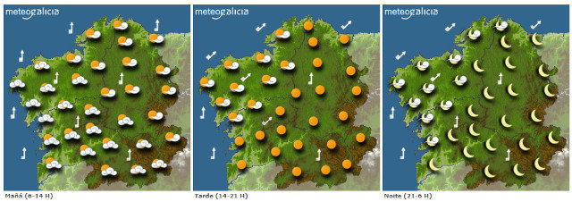A Coruña 14° 20°, Ferrol 13° 20°, Lugo 9° 19°, Ourense 11° 22°, Pontevedra 12° 21°, Santiago 11° 17°, Vigo 12° 21°