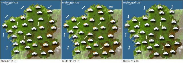 As temperaturas mínimas experimentarán un lixeiro ascenso mentres que as máximas quedarán sen cambios ou con lixeiros descensos. O vento soprará frouxo de compoñente sur.