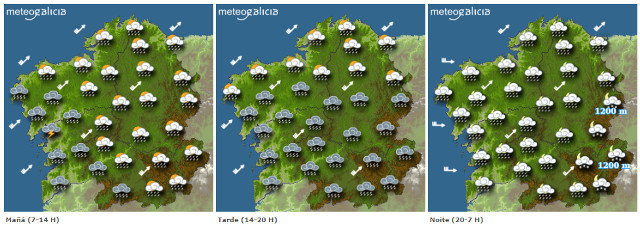 A Coruña 13º/15º; Ferrol 12º/15º, Lugo 9º/12º, Ourense 11º/15º, Pontevedra 11º/15º, Santiago 10º/13º, Vigo 11º/16º.