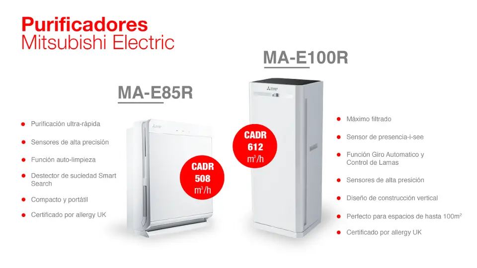 A través de esta unidad podemos hallar la velocidad con la que se puede renovar el aire de una estancia en un valor de metros cúbicos por hora. Los purificadores de aire de Mitsubishi Electric son, en ese sentido, los más eficientes del mercado porque cuentan con un elevado CADR al que se suma la máxima capacidad de filtrado gracias a la incorporación de filtros HEPA. De este modo, los modelos de esta fábrica pueden purificar estancias de hasta 100 metros cuadrados sin ningún problema.