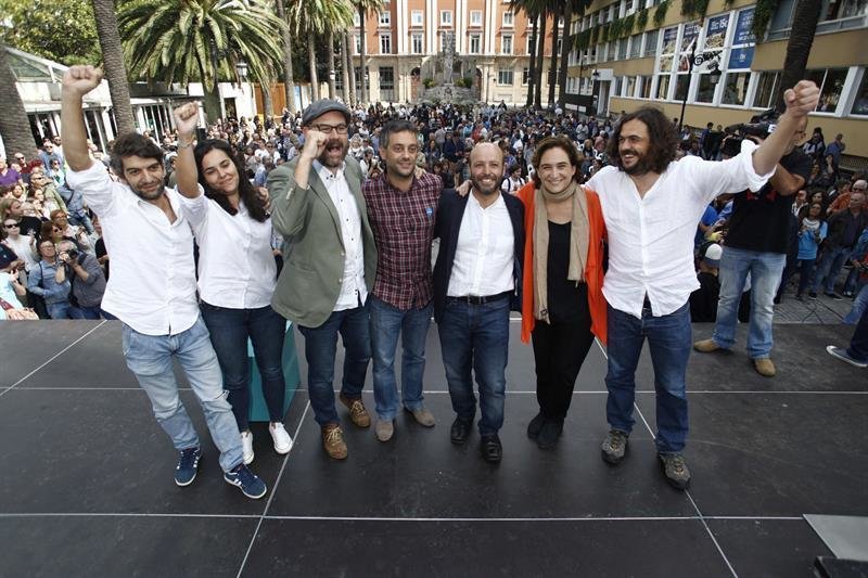 Villares, en 2016 en A Coruña con Jorge Suárez, Luca Chao, Martiño Noriega, Xulio Ferreiro, Ada Colau y Antón Sánchez. Eran otros tiempos. EFE