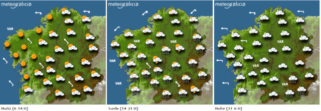 Deste xeito, Galicia amencerá con ceos pouco anubrados en xeral. Pola tarde medrarán nubes de evolución formando chuvascos localmente tormentosos, localmente fortes e mesmo acompañados de sarabia, máis probables no interior.