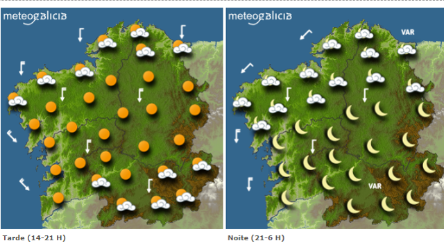 Temperaturas: A Coruña (17º-21º), Lugo (15º-25º), Ourense (18º-15º), Pontevedra (17º-32º), Vigo (17º-28º), Santiago de Compostela (16º-26º).